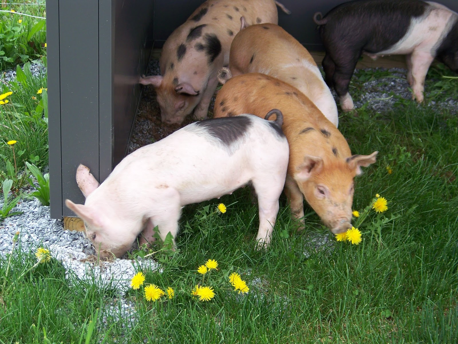 We got 6 pigs this spring! They are so cute. Their names are Gus-gus, Rosie, Angelina, Wilber, Daisy, and Sophie. They were so much fun. They act just like dogs. It's really funny. We are hopefully getting new ones in the spring.